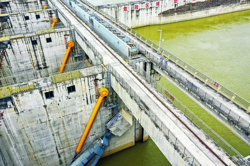 工作人員在邕寧水利樞紐工程攔河大壩進行安全巡查